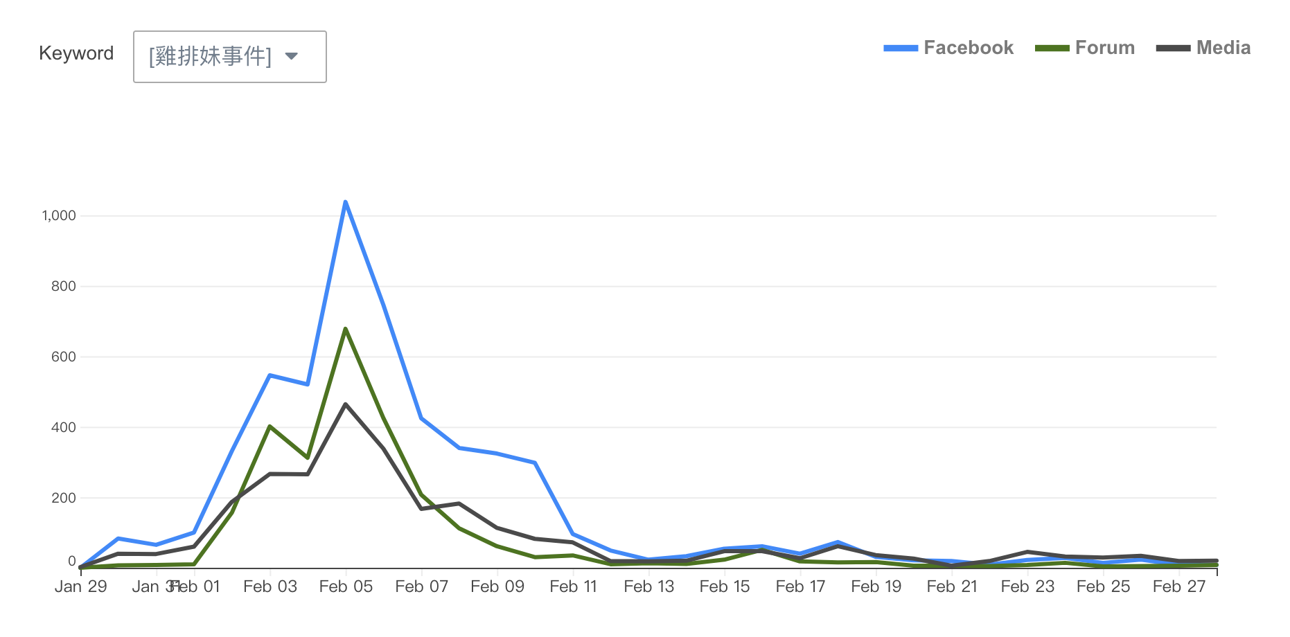 若將關鍵字主題鎖定在「雞排妹、飛機杯」相關,針對「Facebook、論壇、媒體」渠道進行分析,數據上顯示此話題在論壇上的討論最為熱烈,若能即時掌握社群數據,則能在論壇上對議題進行澄清,或是緊抓此議題讓輿論遠離騷擾事件本身。
