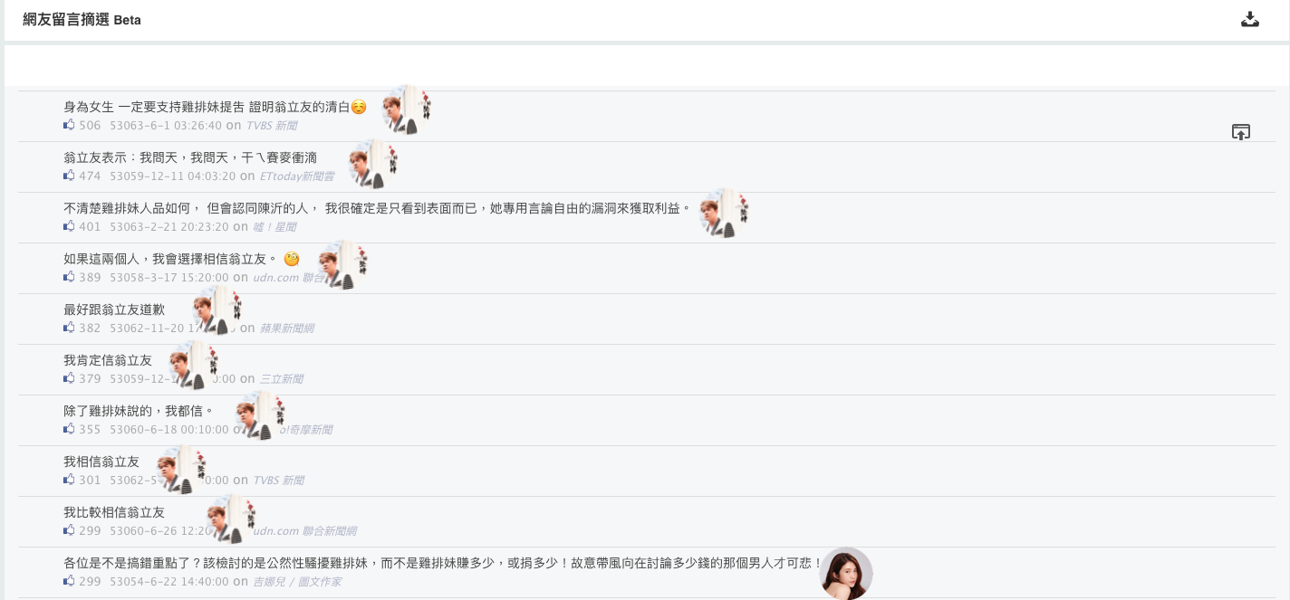 在翁立友記者會後,因為當天現場混亂的因素,導致網路討論出現風向逆轉的契機,由記者會前後的 Facebook 熱門留言比較,就能看出輿情漸漸往雞排妹的方向靠攏,熱門留言前十名在 2/5 前,九成都是偏向翁立友方,而在 2/5 後,則逆轉出現五五波的情況,各有各的擁護者。